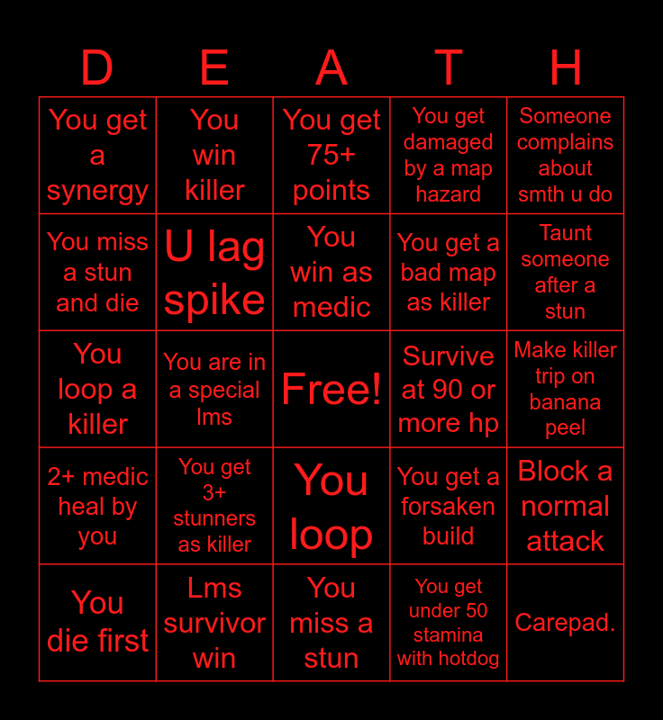 This bingo card has a free space and 24 words: You die first, You get 3+ stunners as killer, You win as medic, You get under 50 stamina with hotdog, Someone complains about smth u do, You get a synergy, You win killer, You get 75+ points, Survive at 90 or more hp, Make killer trip on banana peel, You loop a killer, U lag spike, You get a forsaken build, Block a normal attack, You miss a stun and die, Lms survivor win, You miss a stun, You get damaged by a map hazard, Taunt someone after a stun, 2+ medic heal by you, You are in a special lms, You loop, You get a bad map as killer and Carepad..