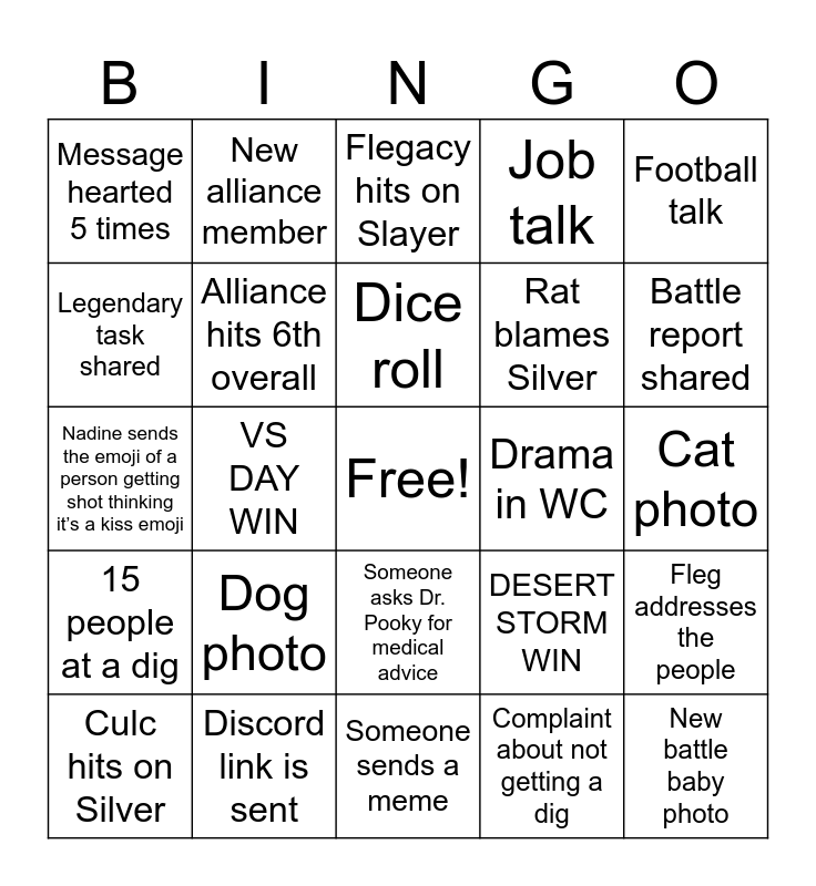 This bingo card has a free space and 24 words: Dog photo, Discord link is sent, Dice roll, Culc hits on Silver, Football talk, Message hearted 5 times, Legendary task shared, New alliance member, Drama in WC, Someone asks Dr. Pooky for medical advice, Rat blames Silver, Nadine sends the emoji of a person getting shot thinking it’s a kiss emoji, DESERT STORM WIN, Fleg addresses the people, Alliance hits 6th overall, Complaint about not getting a dig, Cat photo, Flegacy hits on Slayer, Battle report shared, VS DAY WIN, New battle baby photo, 15 people at a dig, Job talk and Someone sends a meme.