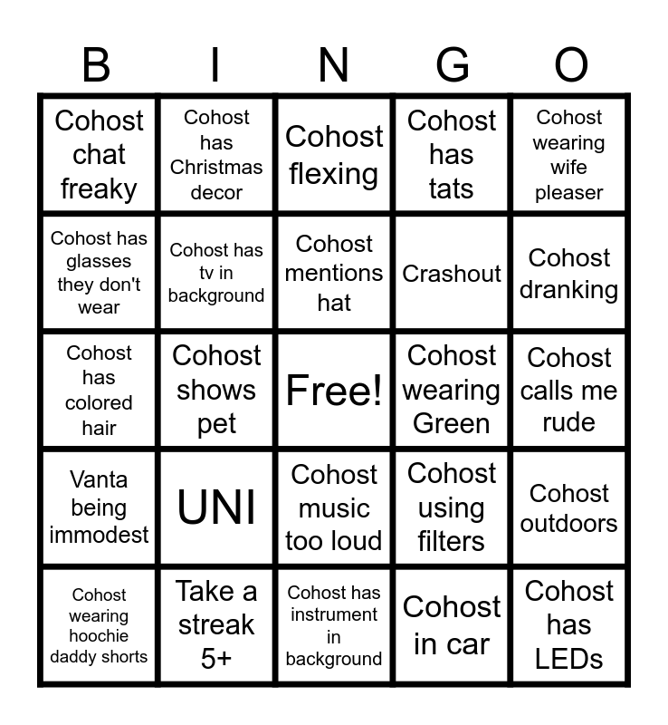 This bingo card has a free space and 24 words: UNI, Take a streak 5+, Cohost mentions hat, Cohost wearing hoochie daddy shorts, Cohost wearing wife pleaser, Cohost chat freaky, Cohost has glasses they don't wear, Cohost has Christmas decor, Cohost wearing Green, Cohost music too loud, Crashout, Cohost has colored hair, Cohost using filters, Cohost outdoors, Cohost has tv in background, Cohost in car, Cohost calls me rude, Cohost flexing, Cohost dranking, Cohost shows pet, Cohost has LEDs, Vanta being immodest, Cohost has tats and Cohost has instrument in background.