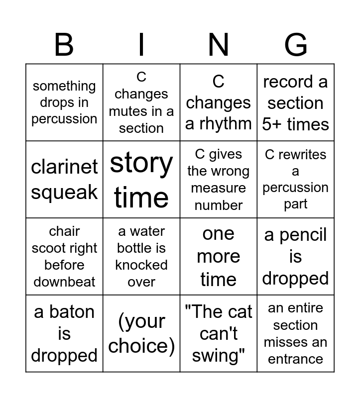 This bingo card has 25 words: Cut off right before tpts come in, add articulation to a slur, C rewrites a percussion part, trumpets stand up, clarinet squeak, something drops in percussion, story time, C changes mutes in a section, (your choice), someone plays way after cutoff, chair scoot right before downbeat, one more time, new version of euphonium concerto, mute drop, C gives the wrong measure number, stand sinks down, "The cat can't swing", C changes a rhythm, a water bottle is knocked over, a pencil is dropped, a baton is dropped, sub 5 minute bathroom break, an entire section misses an entrance, record a section 5+ times and complete a full run of any piece.