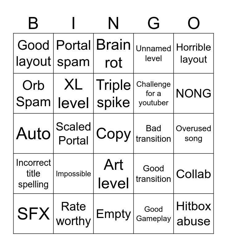 This bingo card has a free space and 24 words: Impossible, Rate worthy, Triple spike, SFX, Horrible layout, Good layout, Orb Spam, Portal spam, Bad transition, Art level, Challenge for a youtuber, Auto, Good transition, Collab, XL level, Good Gameplay, Overused song, Brain rot, NONG, Scaled Portal, Hitbox abuse, Incorrect title spelling, Unnamed level and Empty.