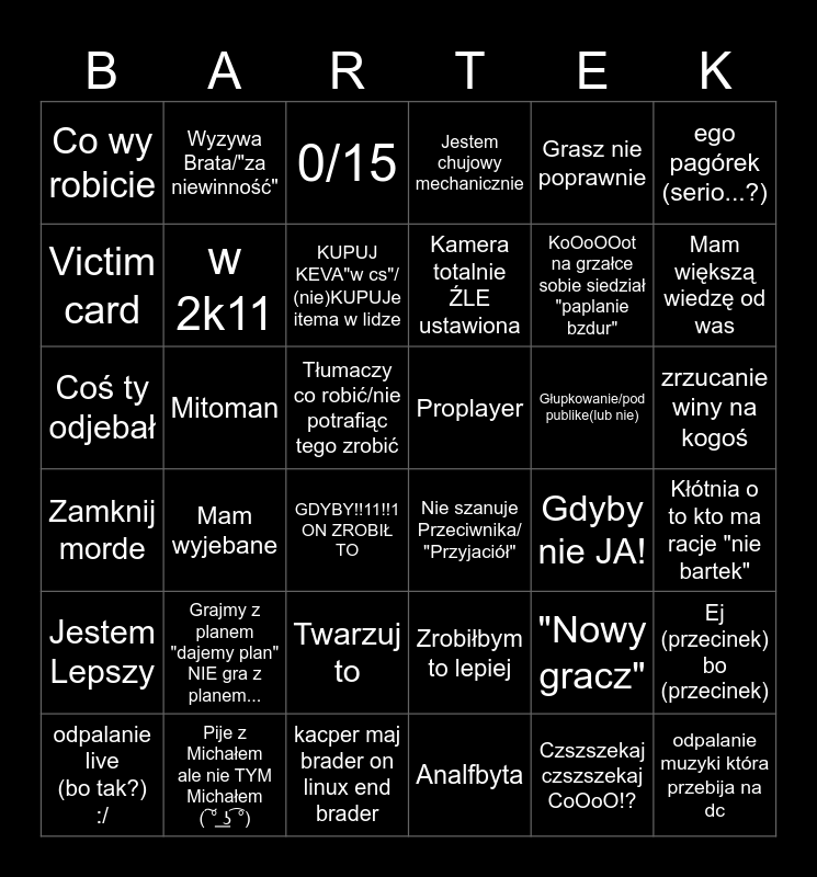 This bingo card has 36 words: Zrobiłbym to lepiej, Twarzuj to, Analfbyta, Victim card, Zamknij morde, Proplayer, w 2k11, kacper maj brader on linux end brader, Grasz nie poprawnie, "Nowy gracz", Mam większą wiedzę od was, Jestem chujowy mechanicznie, Ej (przecinek) bo (przecinek), Mitoman, Kamera totalnie ŹLE ustawiona, Co wy robicie, Jestem Lepszy, Głupkowanie/pod publike(lub nie), Coś ty odjebał, 0/15, Tłumaczy co robić/nie potrafiąc tego zrobić, Mam wyjebane, Nie szanuje Przeciwnika/ "Przyjaciół", GDYBY!!11!!1 ON ZROBIŁ TO, Gdyby nie JA!, Wyzywa Brata/"za niewinność", KoOoOOot na grzałce sobie siedział "paplanie bzdur", Pije z Michałem ale nie TYM Michałem ( ͠° ͟ʖ ͡°), KUPUJ KEVA"w cs"/ (nie)KUPUJe itema w lidze, ego pagórek (serio...?), odpalanie muzyki która przebija na dc, odpalanie live (bo tak?) :/, Kłótnia o to kto ma racje "nie bartek", zrzucanie winy na kogoś, Grajmy z planem "dajemy plan" NIE gra z planem... and Czszszekaj czszszekaj CoOoO!?.