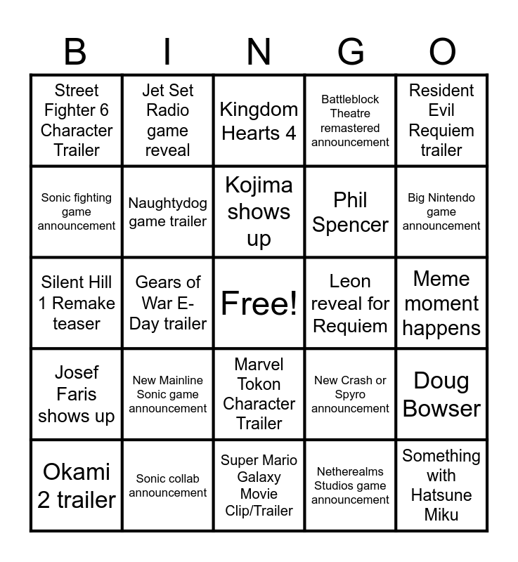 This bingo card has a free space and 24 words: New Mainline Sonic game announcement, Sonic collab announcement, Kojima shows up, Okami 2 trailer, Resident Evil Requiem trailer, Street Fighter 6 Character Trailer, Sonic fighting game announcement, Jet Set Radio game reveal, Leon reveal for Requiem, Marvel Tokon Character Trailer, Phil Spencer, Silent Hill 1 Remake teaser, New Crash or Spyro announcement, Doug Bowser, Naughtydog game trailer, Netherealms Studios game announcement, Meme moment happens, Kingdom Hearts 4, Big Nintendo game announcement, Gears of War E-Day trailer, Something with Hatsune Miku, Josef Faris shows up, Battleblock Theatre remastered announcement and Super Mario Galaxy Movie Clip/Trailer.