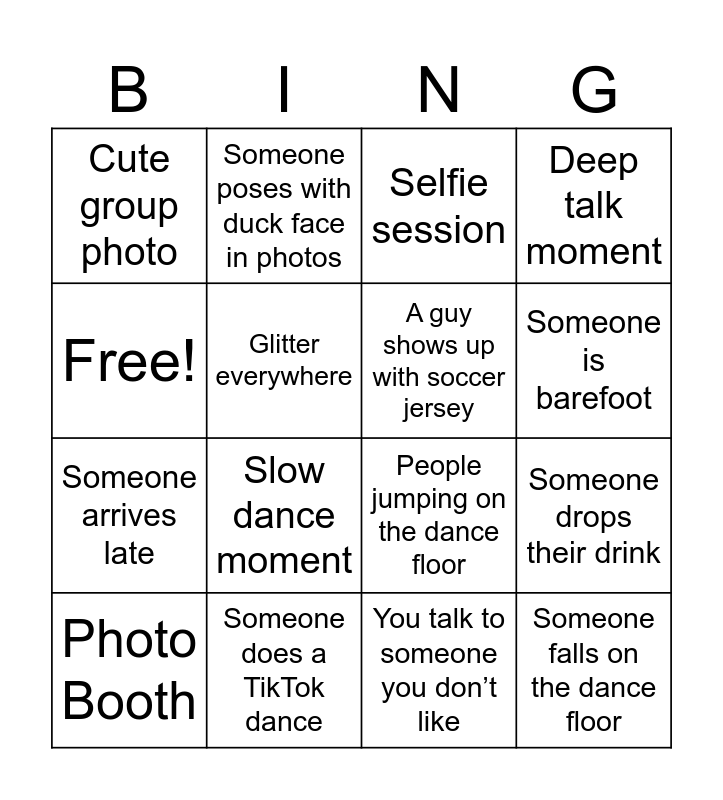 This bingo card has 16 words: Someone does a TikTok dance, Someone drops their drink, Selfie session, Cute group photo, Someone arrives late, Someone poses with duck face in photos, People jumping on the dance floor, You talk to someone you don’t like, Free!, Glitter everywhere, Photo Booth, Deep talk moment, Slow dance moment, Someone is barefoot, A guy shows up with soccer jersey and Someone falls on the dance floor.