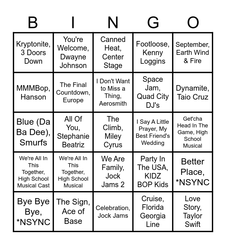 This bingo card has 60 words: Buy Dirt, Jordan Davis, The Sign, Ace of Base, This One's for the Girls, Martina McBride, We're All In This Together, High School Musical Cast, Cruise, Florida Georgia Line, Eye of the Tiger, Survivor, The Final Countdown, Europe, What Makes You Beautiful, One Direction, Space Jam, Quad City DJ's, I Just Can't Wait to Be King, Jason Weaver, Footloose, Kenny Loggins, Don't Stop Believin', Journey, MMMBop, Hanson, My Girl, The Temptations, Signed, Sealed, Delivered, Stevie Wonder, Kryptonite, 3 Doors Down, The Climb, Miley Cyrus, September, Earth Wind & Fire, Summer Of '69, Bryan Adams, I Don't Want to Miss a Thing, Aerosmith, I Say A Little Prayer, My Best Friend's Wedding, Canned Heat, Center Stage, Bye Bye Bye, *NSYNC, Better Place, *NSYNC, Party In The U.S.A., Miley Cyrus, Peaches, Jack Black, Seasons of Love, RENT, Thunder, Imagine Dragons, Dynamite, Taio Cruz, The Greatest Show, Panic! At The Disco, Let It Go, Idina Menzel, Who Let The Dogs Out, KIDZ BOP Kids, I'm A Believer, Smash Mouth, Try Everything, Shakira, You're Welcome, Dwayne Johnson, You've Got a Friend in Me, Randy Newman, Friend Like Me, Will Smith, All Of You, Stephanie Beatriz, How Far I'll Go, Auli'i Cravalho, Blue (Da Ba Dee), Smurfs, Life's A Happy Song, The Muppets, We're All In This Together, High School Musical, Get'cha Head In The Game, High School Musical, Shake It Off, KIDZ BOP Kids, Party In The USA, KIDZ BOP Kids, Cheerleader, KIDZ BOP Kids, Happy, KIDZ BOP Kids, Call Me Maybe, KIDZ BOP Kids, Cotton Eyed Joe, Jock Jams, We Are Family, Jock Jams 2, Celebration, Jock Jams, Dynamite, Taio Cruz, Cupid Shuffle, Cupid, Pump It Up, Endor, The Greatest Show, The Greatest Showman, CAN'T STOP THE FEELING!, TROLLS, Sweet Caroline, Neil Diamond, Life is a Highway, Rascal Flatts, Love Story, Taylor Swift and Opalite, Taylor Swift.
