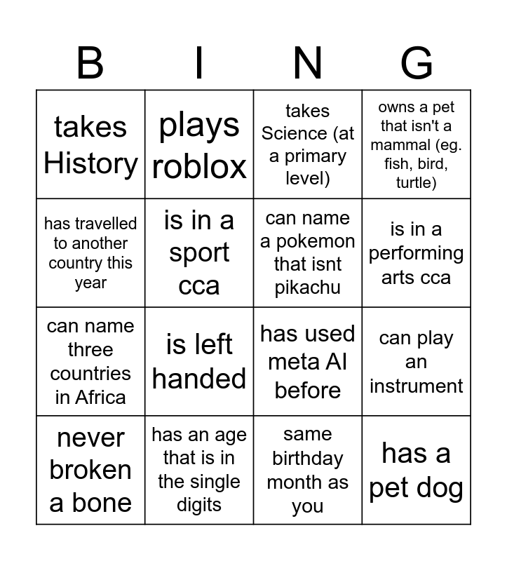 This bingo card has 19 words: has used meta AI before, can whistle, takes Science (at a primary level), has a pet dog, can play an instrument, has travelled to another country this year, same birthday month as you, takes History, plays roblox, can name three countries in Africa, is left handed, is in a sport cca, can name a pokemon that isnt pikachu, has an age that is in the single digits, never broken a bone, has more than one sibling, owns a pet that isn't a mammal (eg. fish, bird, turtle), is in a performing arts cca and has a hitchhiker's thumb.