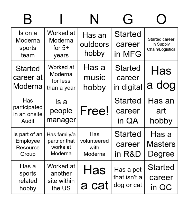 This bingo card has a free space and 27 words: Started career in R&D, Has worked in the industry for 10+ years, Started career in digital, Has a cat, Started career at Moderna, Has an outdoors hobby, Worked at Moderna for 5+ years, Is part of an Employee Resource Group, Started career in QA, Has a Masters Degree, Has participated in an onsite Audit, Started career in MFG, Has a sports related hobby, Worked at another site within the US, Has a dog, Worked at a Resilience site outside of the US, Worked at Moderna for less than a year, Has a music hobby, Has family/a partner that works at Moderna, Is on a Moderna sports team, Has an art hobby, Has a pet that isn't a dog or cat, Is a people manager, Started career in QC, Has volunteered with Moderna, Started career in Supply Chain/Logistics and Attending their first networking event.