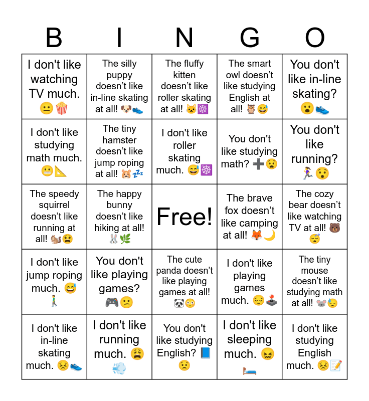 This bingo card has a free space and 33 words: You don't like hiking? ๐ฏ๐ฒ, I don't like hiking much. ๐๐ฅพ, The happy bunny doesnโt like hiking at all! ๐ฐ๐ฟ, You don't like jump roping? ๐๐คธโโ๏ธ, I don't like jump roping much. ๐ ๐ถโโ๏ธ, The tiny hamster doesnโt like jump roping at all! ๐น๐ค, You don't like in-line skating? ๐ฎ๐, I don't like in-line skating much. ๐ฃ๐, The silly puppy doesnโt like in-line skating at all! ๐ถ๐, You don't like roller skating? ๐โธ๏ธ, I don't like roller skating much. ๐ โธ๏ธ, The fluffy kitten doesnโt like roller skating at all! ๐ฑโธ๏ธ, You don't like camping? ๐๏ธ๐ง, I don't like camping much. ๐๐ฅ, The brave fox doesnโt like camping at all! ๐ฆ๐, You don't like running? ๐โโ๏ธ๐ฏ, I don't like running much. ๐ฉ๐จ, The speedy squirrel doesnโt like running at all! ๐ฟ๏ธ๐ซ, You don't like playing games? ๐ฎ๐, I don't like playing games much. ๐๐น๏ธ, The cute panda doesnโt like playing games at all! ๐ผ๐ณ, You don't like watching TV? ๐บ๐ฎ, I don't like watching TV much. ๐๐ฟ, The cozy bear doesnโt like watching TV at all! ๐ป๐ด, You don't like studying English? ๐๐, I don't like studying English much. ๐ฃ๐, The smart owl doesnโt like studying English at all! ๐ฆ๐ , You don't like studying math? โ๐ง, I don't like studying math much. ๐ฌ๐, The tiny mouse doesnโt like studying math at all! ๐ญ๐, You don't like sleeping? ๐ด๐ฒ, I don't like sleeping much. ๐๐๏ธ and The soft bunny doesnโt like sleeping at all! ๐ฐ๐ช.