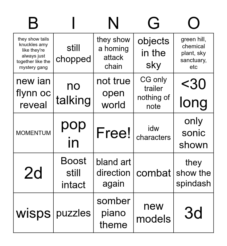 This bingo card has a free space and 24 words: Boost still intact, puzzles, not true open world, wisps, green hill, chemical plant, sky sanctuary, etc, they show tails knuckles amy like they're always just together like the mystery gang, new ian flynn oc reveal, still chopped, idw characters, bland art direction again, CG only trailer nothing of note, MOMENTUM, combat, they show the spindash, no talking, new models, only sonic shown, they show a homing attack chain, <30 long, pop in, 3d, 2d, objects in the sky and somber piano theme.