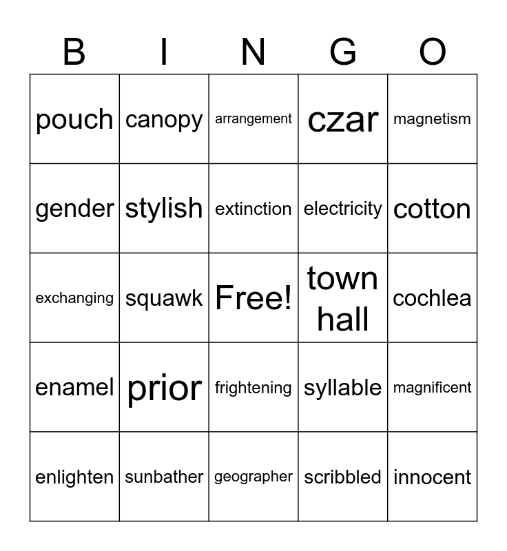 This bingo card has a free space and 270 words: accomplished, attic, campfire, craftsman, electron, accordion, autopsy, canopy, creepy, enamel, accused, awesome, cardigan, crow, enclosure, acquire, background, carousel, cruise, encouraged, adjacent, banquets, cephalothorax, crust, enlighten, advertisement, barefoot, cerebellum, cuddly, enthusiastic, aghast, beanie, ceremonial, cunning, equivalent, airborne, behavior, chandelier, curled, erosion, amazement, Benedictine, circuit, current, excavate, ambitious, bind, clothing, cutaneous, exchanging, amused, binoculars, clucking, cymbals, exercise, amusement, bitterness, clumsy, czar, exhaustion, anthropologist, boardwalk, cobblestone, decadence, exploitation, apologizing, botanist, cochlea, deforestation, extinction, appetizer, breakdown, cockatiel, delightful, fertilization, applaud, breathless, cocoa, deliver, fictitious, appliances, brokenhearted, collection, denominator, fisherman, appreciate, brook, comfortable, diaphragm, foolish, apprentice, bruise, committed, disgusting, foreground, aquamarines, budget, committee, draft, forgotten, archaeologist, buffalo, conductor, dynamite, frightening, arrangement, bulldozer, core, earmuffs, frisbee, associate, bungalow, cotton, echo, frustration, atmosphere, buzzes, cougar, eclipse, fundraiser, attachment, calculation, course, electricity, gender, gentleman, hollow, maroon, pastries, sketches, geographer, hologram, mathematician, permission, sleeker, geothermal, humongous, measurement, pizzeria, smartphone, geyser, humus, mediocre, poisonous, spectrum, gondola, hydrant, meows, Polish, spherical, gondolier, icicle, metamorphic, pouch, squawk, goose, igneous, Michelangelo, predicament, startled, greatness, illegally, mighty, pregnancy, stirrup, groan, illusion, moan, prehistoric, stoop, grotesque, immediately, monarchy, prior, struck, grown, immigration, neighborhood, prospective, stubborn, grumble, improvise, nineteenth, proton, stylish, hammock, infantry, noble, provide, substitution, harmonica, innocent, noticeably, quarry, suggested, Hawaii, insulator, nourishment, radiation, summit, headgear, interesting, nugget, radishes, sunbather, heaven, investigate, nuisance, rafting, supply, heirloom, Jerusalem, oddly, ranger, surrounded, herbivore, kinetic, opossum, rapids, susceptible, heritage, learner, opportunity, scholarship, swallow, hiccups, lifeguard, orchestra, scratched, swelling, highway, loose, ornaments, scribbled, swirling, hikers, lose, ostrich, scuba diving, syllable, hisses, magnetism, overflow, sculptor, thermos, Holland, magnificent, passengers, sculpture, thermostat, though, town hall, unexpected, veterinarian, whiskers, thoughtfully, tremendous, unpredictable, wacky, who's, thrilled, unbelievable, unwrapped, wallet, whose, throughout, underneath, venture, weightless and witnesses.