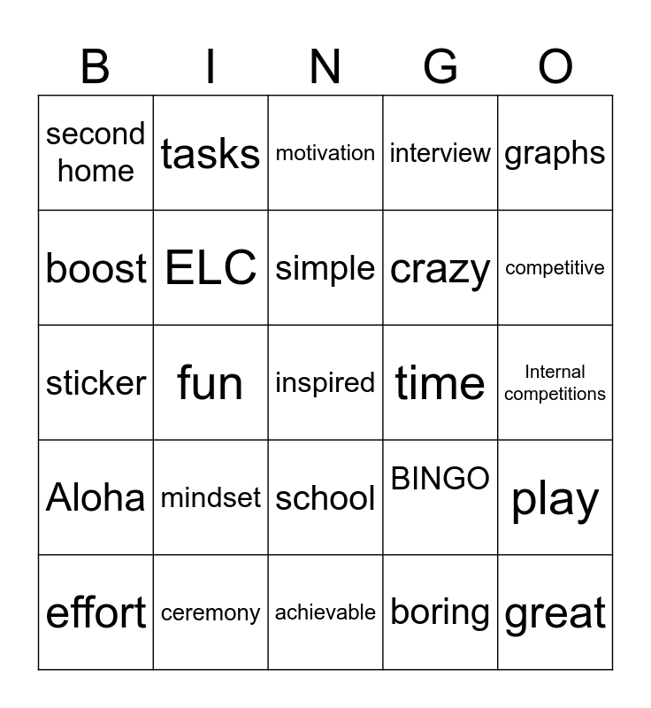 This bingo card has 25 words: mindset, achievable, simple, effort, graphs, second home, boost, tasks, time, school, crazy, sticker, BINGO, play, ELC, great, Internal competitions, motivation, competitive, fun, inspired, ceremony, Aloha, interview and boring.