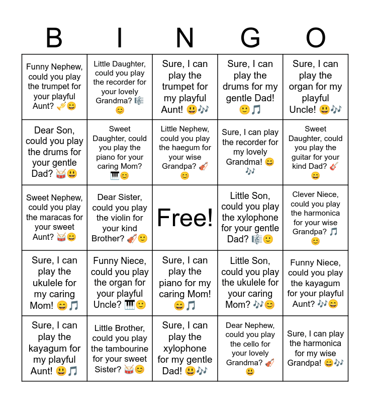 This bingo card has a free space and 30 words: Little Brother, could you play the tambourine for your sweet Sister? π₯π, Sure, I can play the tambourine for my sweet Sister! ππΆ, Dear Sister, could you play the violin for your kind Brother? π»π, Sure, I can play the violin for my kind Brother! ππ΅, Funny Nephew, could you play the trumpet for your playful Aunt? πΊπ, Sure, I can play the trumpet for my playful Aunt! ππΆ, Sweet Daughter, could you play the piano for your caring Mom? πΉπ, Sure, I can play the piano for my caring Mom! ππ΅, Little Son, could you play the xylophone for your gentle Dad? πΌπ, Sure, I can play the xylophone for my gentle Dad! ππΆ, Clever Niece, could you play the harmonica for your wise Grandpa? π΅π, Sure, I can play the harmonica for my wise Grandpa! ππΆ, Dear Nephew, could you play the cello for your lovely Grandma? π»π, Sure, I can play the cello for my lovely Grandma! ππ΅, Sweet Daughter, could you play the guitar for your kind Dad? πΈπ, Sure, I can play the guitar for my kind Dad! ππΆ, Little Son, could you play the ukulele for your caring Mom? πΆπ, Sure, I can play the ukulele for my caring Mom! ππ΅, Funny Niece, could you play the organ for your playful Uncle? πΉπ, Sure, I can play the organ for my playful Uncle! ππΆ, Sweet Nephew, could you play the maracas for your sweet Aunt? π₯π, Sure, I can play the maracas for my sweet Aunt! ππ΅, Little Daughter, could you play the recorder for your lovely Grandma? πΌπ, Sure, I can play the recorder for my lovely Grandma! ππΆ, Dear Son, could you play the drums for your gentle Dad? π₯π, Sure, I can play the drums for my gentle Dad! ππ΅, Funny Niece, could you play the kayagum for your playful Aunt? πΆπ, Sure, I can play the kayagum for my playful Aunt! ππ΅, Little Nephew, could you play the haegum for your wise Grandpa? π»π and Sure, I can play the haegum for my wise Grandpa! ππΆ.