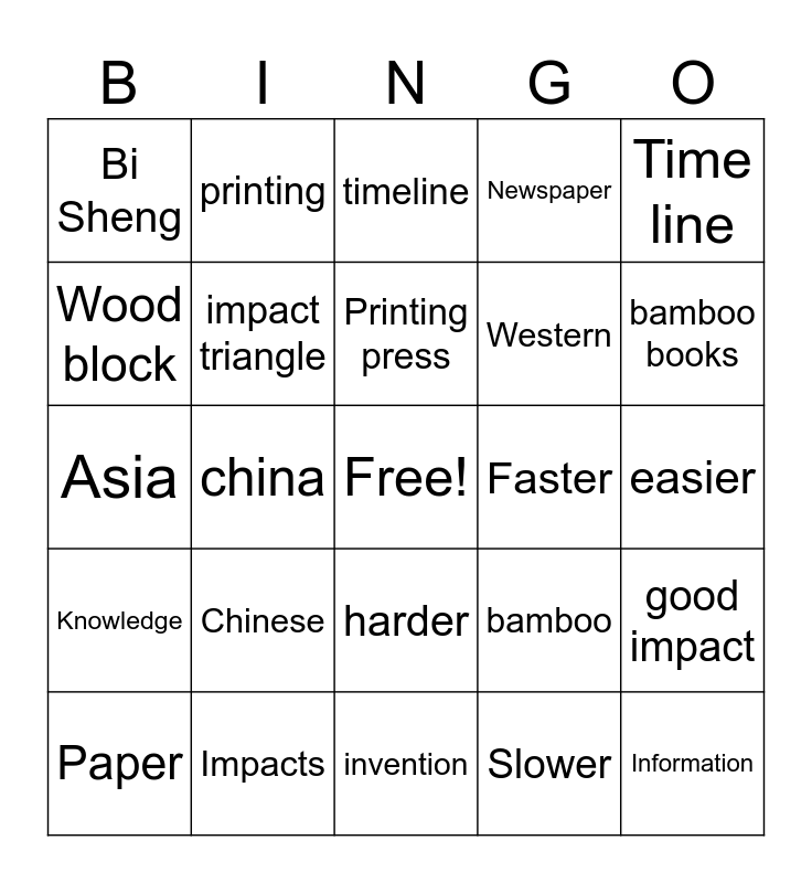 This bingo card has a free space and 24 words: Chinese, Impacts, Printing press, Paper, Time line, Bi Sheng, Wood block, printing, Faster, harder, Western, Asia, bamboo, good impact, impact triangle, Slower, easier, timeline, bamboo books, china, Information, Knowledge, Newspaper and invention.