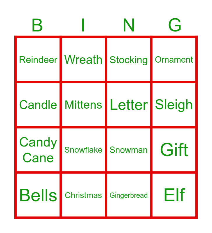 This bingo card has 16 words: Christmas, Gift, Stocking, Reindeer, Candy Cane, Wreath, Snowman, Gingerbread, Candle, Mittens, Bells, Ornament, Snowflake, Sleigh, Letter and Elf.