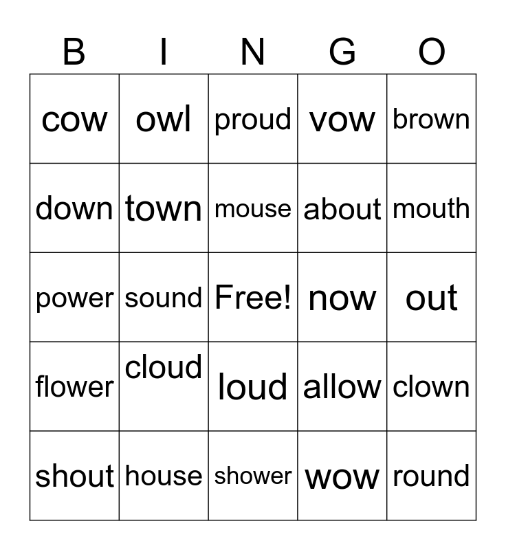 This bingo card has a free space and 24 words: cloud, house, mouse, shout, brown, cow, down, owl, now, loud, about, power, allow, clown, town, wow, out, proud, mouth, sound, round, flower, vow and shower.