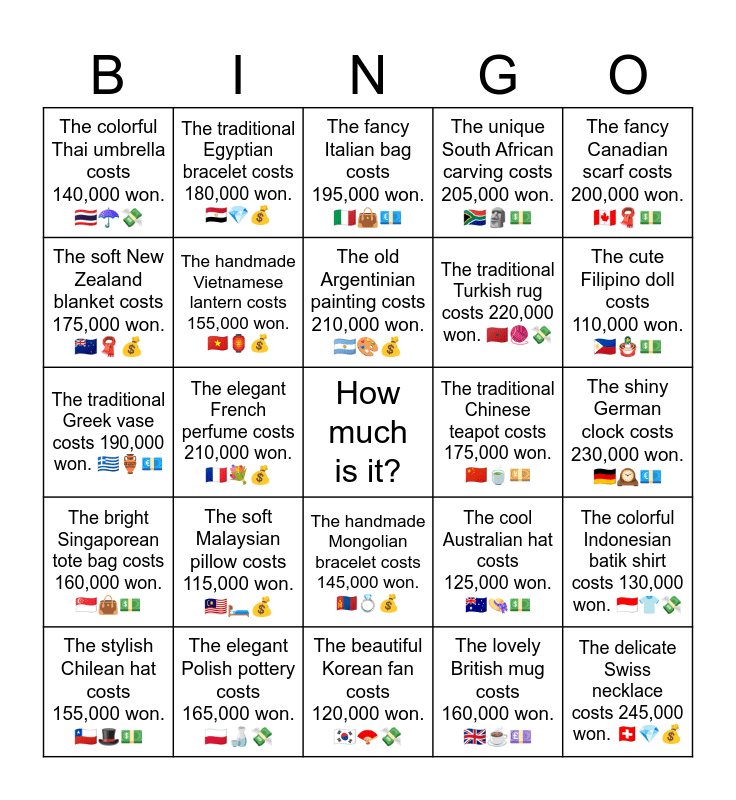This bingo card has a free space and 31 words: The beautiful Korean fan costs 120,000 won. ๐ฐ๐ท๐ชญ๐ธ, The cute Japanese keychain costs 135,000 won. ๐ฏ๐ต๐๐ด, The elegant French perfume costs 210,000 won. ๐ซ๐ท๐๐ฐ, The shiny American watch costs 185,000 won. ๐บ๐ธโ๐ต, The colorful Thai umbrella costs 140,000 won. ๐น๐ญโ๏ธ๐ธ, The fancy Italian bag costs 195,000 won. ๐ฎ๐น๐๐ถ, The handmade Vietnamese lantern costs 155,000 won. ๐ป๐ณ๐ฎ๐ฐ, The cool Australian hat costs 125,000 won. ๐ฆ๐บ๐๐ต, The traditional Chinese teapot costs 175,000 won. ๐จ๐ณ๐ต๐ด, The lovely British mug costs 160,000 won. ๐ฌ๐งโ๐ท, The shiny German clock costs 230,000 won. ๐ฉ๐ช๐ฐ๏ธ๐ถ, The delicate Swiss necklace costs 245,000 won. ๐จ๐ญ๐๐ฐ, The colorful Indian scarf costs 150,000 won. ๐ฎ๐ณ๐งฃ๐ธ, The beautiful Turkish lamp costs 190,000 won. ๐น๐ท๐ก๐ฐ, The cute Filipino doll costs 110,000 won. ๐ต๐ญ๐ช๐ต, The elegant Spanish fan costs 170,000 won. ๐ช๐ธ๐ชญ๐ถ, The colorful Indonesian batik shirt costs 130,000 won. ๐ฎ๐ฉ๐๐ธ, The soft Malaysian pillow costs 115,000 won. ๐ฒ๐พ๐๏ธ๐ฐ, The bright Singaporean tote bag costs 160,000 won. ๐ธ๐ฌ๐๐ต, The handmade Mongolian bracelet costs 145,000 won. ๐ฒ๐ณ๐๐ฐ, The fancy Canadian scarf costs 200,000 won. ๐จ๐ฆ๐งฃ๐ต, The colorful Nepali pouch costs 125,000 won. ๐ณ๐ต๐๐ฐ, The stylish Chilean hat costs 155,000 won. ๐จ๐ฑ๐ฉ๐ต, The traditional Egyptian bracelet costs 180,000 won. ๐ช๐ฌ๐๐ฐ, The traditional Turkish rug costs 220,000 won. ๐ฒ๐ฆ๐งถ๐ธ, The soft New Zealand blanket costs 175,000 won. ๐ณ๐ฟ๐งฃ๐ฐ, The unique South African carving costs 205,000 won. ๐ฟ๐ฆ๐ฟ๐ต, The traditional Greek vase costs 190,000 won. ๐ฌ๐ท๐บ๐ถ, The elegant Polish pottery costs 165,000 won. ๐ต๐ฑ๐ถ๐ธ, The old Argentinian painting costs 210,000 won. ๐ฆ๐ท๐จ๐ฐ and The tiny Austrian music box costs 240,000 won. ๐ฆ๐น๐ต๐ถ.