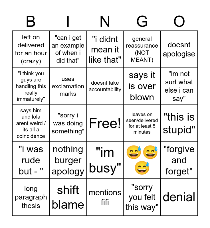 This bingo card has a free space and 24 words: nothing burger apology, shift blame, doesnt take accountability, long paragraph thesis, doesnt apologise, left on delivered for an hour (crazy), "i think you guys are handling this really immaturely", "can i get an example of when i did that", leaves on seen/delivered for at least 5 minutes, "im busy", says it is over blown, says him and lola arent weird / its all a coincidence, 😅😅😅, "forgive and forget", uses exclamation marks, "sorry you felt this way", "this is stupid", "i didnt mean it like that", "im not surt what else i can say", "sorry i was doing something", denial, "i was rude but - ", general reassurance (NOT MEANT) and mentions fifi.