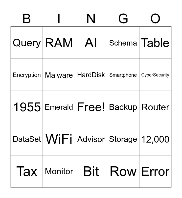 This bingo card has a free space and 24 words: WiFi, Monitor, HardDisk, Tax, Table, Query, Encryption, RAM, Backup, Advisor, Smartphone, 1955, Storage, 12,000, Malware, Row, Router, AI, CyberSecurity, Emerald, Error, DataSet, Schema and Bit.