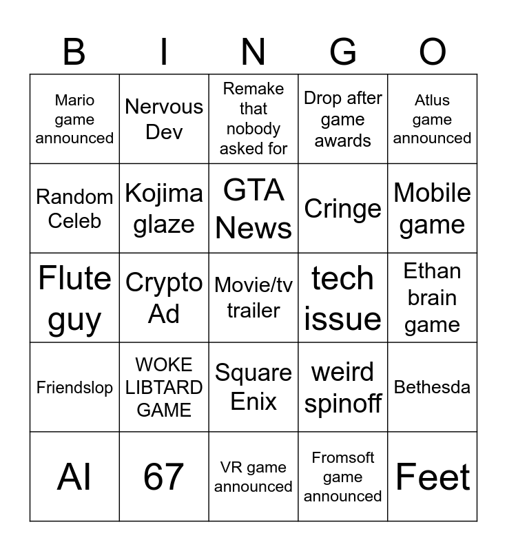 This bingo card has a free space and 24 words: AI, WOKE LIBTARD GAME, GTA News, Fromsoft game announced, Atlus game announced, Mario game announced, Nervous Dev, Remake that nobody asked for, tech issue, Ethan brain game, Flute guy, Kojima glaze, weird spinoff, Bethesda, Random Celeb, 67, VR game announced, Drop after game awards, Mobile game, Friendslop, Crypto Ad, Square Enix, Cringe and Feet.