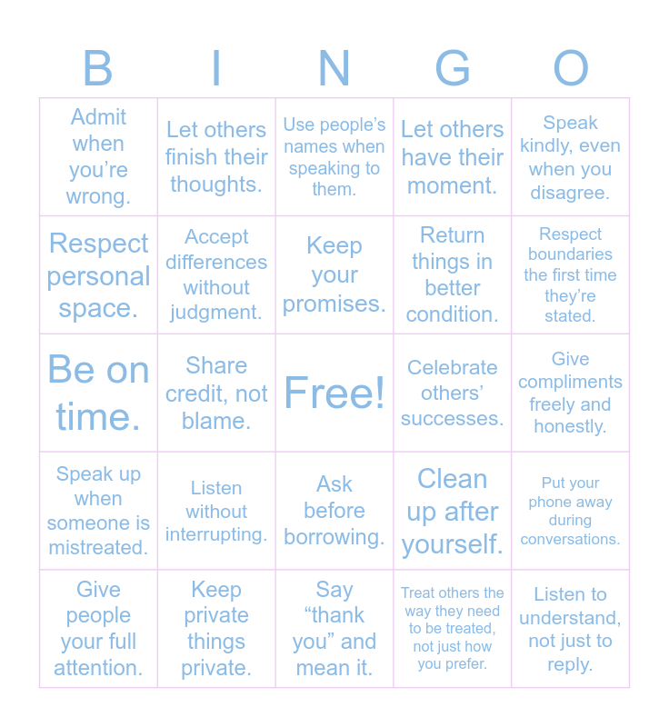 This bingo card has a free space and 25 words: Listen without interrupting., Say “thank you” and mean it., Keep your promises., Give people your full attention., Speak kindly, even when you disagree., Admit when you’re wrong., Respect personal space., Let others finish their thoughts., Celebrate others’ successes., Ask before borrowing., Return things in better condition., Be on time., Clean up after yourself., Put your phone away during conversations., Accept differences without judgment., Offer help without being asked., Give compliments freely and honestly., Use people’s names when speaking to them., Respect boundaries the first time they’re stated., Share credit, not blame., Listen to understand, not just to reply., Keep private things private., Speak up when someone is mistreated., Let others have their moment. and Treat others the way they need to be treated, not just how you prefer..