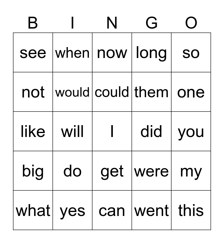 This bingo card has a free space and 25 words: do, can, could, what, so, see, not, when, did, get, them, like, were, my, would, your, you, now, one, will, this, yes, big, long and went.