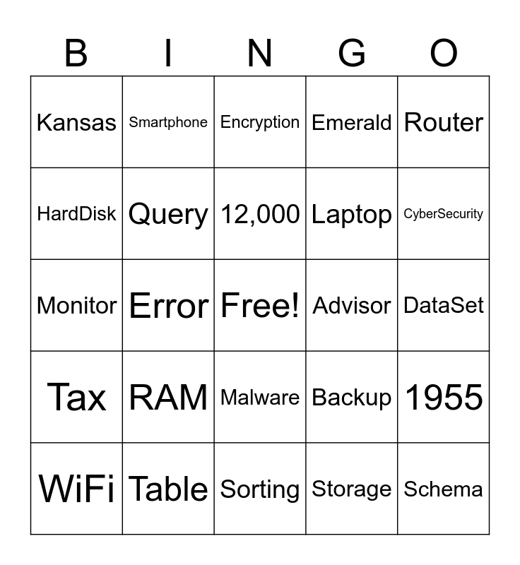 This bingo card has a free space and 24 words: RAM, Table, 12,000, WiFi, Router, Kansas, HardDisk, Smartphone, Advisor, Malware, Laptop, Monitor, Backup, 1955, Query, Storage, DataSet, Encryption, CyberSecurity, Error, Schema, Tax, Emerald and Sorting.