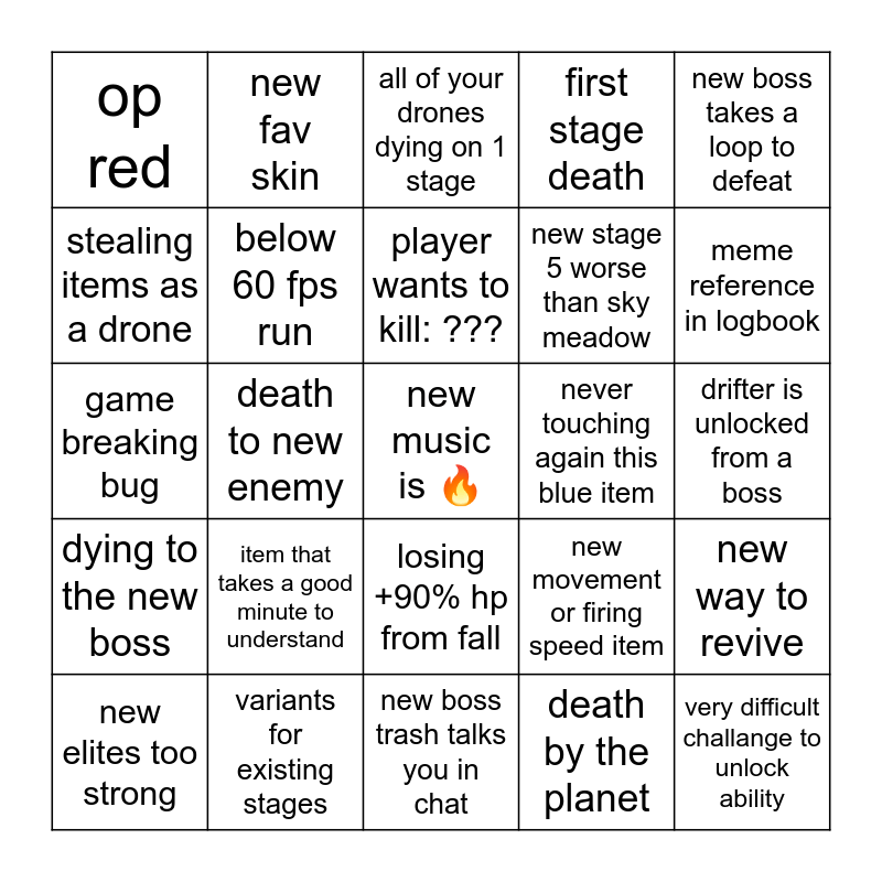 This bingo card has a free space and 24 words: new elites too strong, item that takes a good minute to understand, player wants to kill: ???, death by the planet, new boss takes a loop to defeat, op red, new fav skin, all of your drones dying on 1 stage, never touching again this blue item, drifter is unlocked from a boss, game breaking bug, below 60 fps run, new movement or firing speed item, new way to revive, stealing items as a drone, variants for existing stages, new boss trash talks you in chat, first stage death, meme reference in logbook, dying to the new boss, death to new enemy, losing +90% hp from fall, new stage 5 worse than sky meadow and very difficult challange to unlock ability.