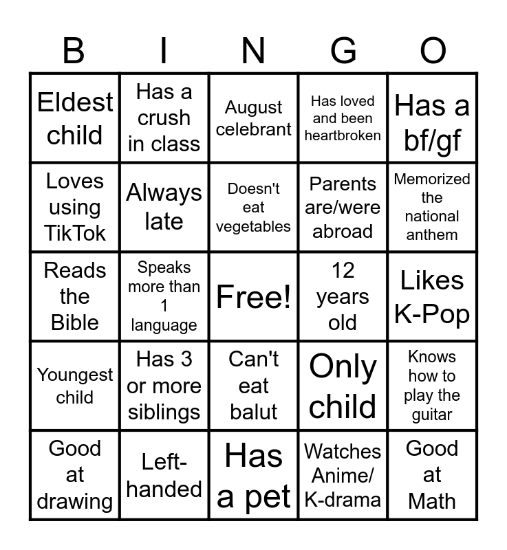 This bingo card has a free space and 24 words: Has 3 or more siblings, Left-handed, Doesn't eat vegetables, Good at drawing, Has a bf/gf, Eldest child, Loves using TikTok, Has a crush in class, 12 years old, Can't eat balut, Parents are/were abroad, Reads the Bible, Only child, Knows how to play the guitar, Always late, Watches Anime/ K-drama, Likes K-Pop, August celebrant, Memorized the national anthem, Speaks more than 1 language, Good at Math, Youngest child, Has loved and been heartbroken and Has a pet.
