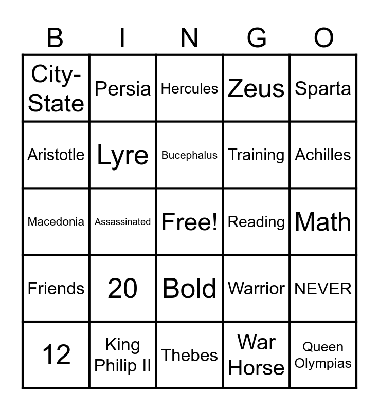 This bingo card has a free space and 24 words: 20, King Philip II, Bucephalus, 12, Sparta, City-State, Aristotle, Persia, Reading, Bold, Training, Macedonia, Warrior, NEVER, Lyre, War Horse, Math, Hercules, Achilles, Assassinated, Queen Olympias, Friends, Zeus and Thebes.