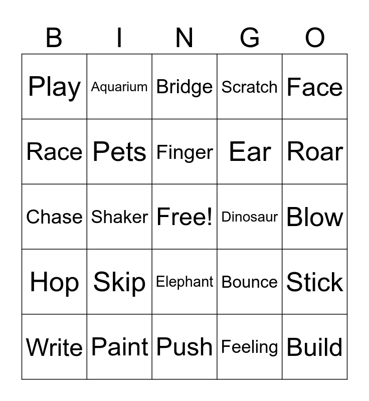 This bingo card has a free space and 39 words: School, Fruit, Shut, Pets, Write, Elephant, Finger, Soil, Face, Hop, Shaker, Scratch, Build, Blow, Dinosaur, Skip, Spy, Play, Cook, Bounce, Race, Push, Ear, Roar, Cut, Hanger, Party, Jobs, Slide, Aquarium, Carrot, Animal, Bridge, Paint, Feeling, Scared, Stick, Chase and Twirl.