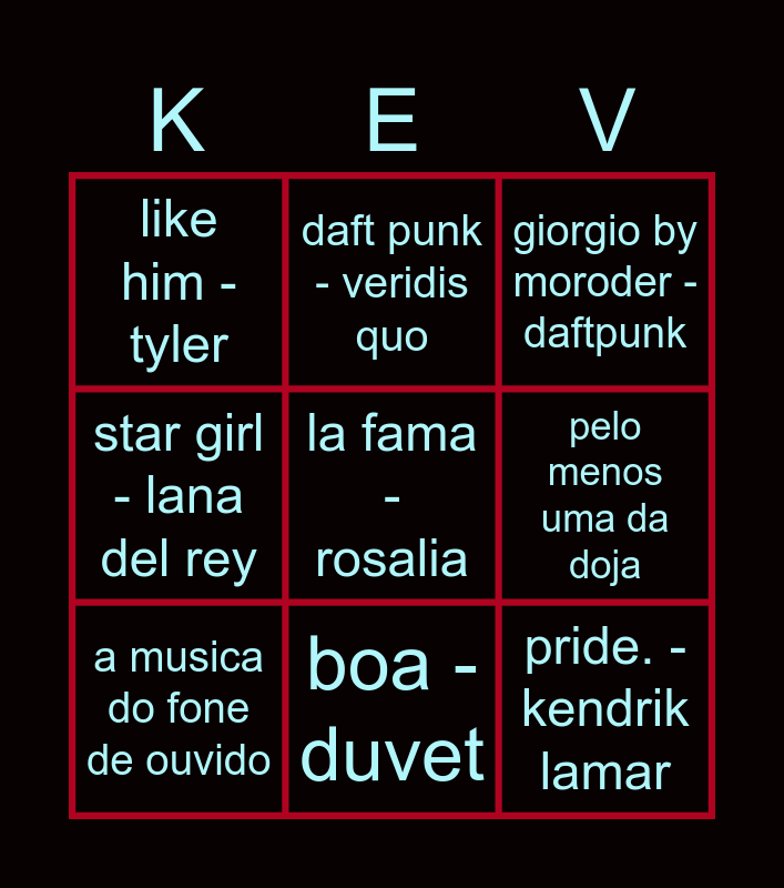 This bingo card has 9 words: a musica do fone de ouvido, giorgio by moroder - daftpunk, daft punk - veridis quo, star girl - lana del rey, like him - tyler, pelo menos uma da doja, la fama - rosalia, pride. - kendrik lamar and boa - duvet.