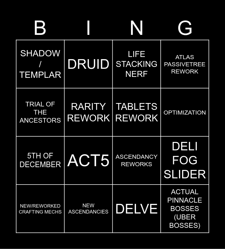 This bingo card has 16 words: NEW ASCENDANCIES, DELI FOG SLIDER, LIFE STACKING NERF, SHADOW / TEMPLAR, 5TH OF DECEMBER, DRUID, ASCENDANCY REWORKS, DELVE, TRIAL OF THE ANCESTORS, RARITY REWORK, NEW/REWORKED CRAFTING MECHS, ATLAS PASSIVETREE REWORK, ACT5, OPTIMIZATION, TABLETS REWORK and ACTUAL PINNACLE BOSSES (UBER BOSSES).