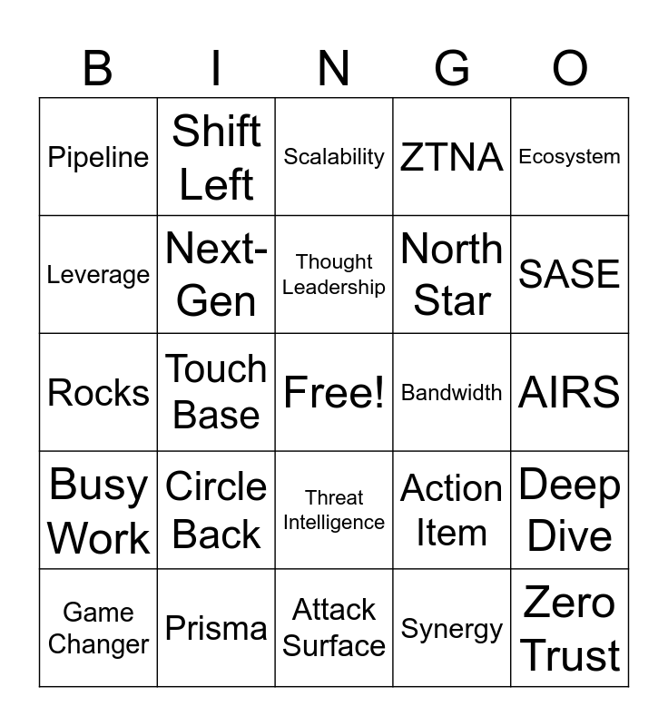 This bingo card has a free space and 53 words: Platform, Zero Trust, Low-Hanging Fruit, Synergy, Circle Back, Win-Win, Shift Left, Take it Offline, Leverage, Best of Breed, Next-Gen, Value Prop, Deep Dive, Action Item, Quick Win, Game Changer, Thought Leadership, Bandwidth, On the same page, Ecosystem, Touch Base, Move the Needle, North Star, Pipeline, Single pane of glass, Prisma, Strata, Das haben wir schon immer so gemacht, Machine Learning, SASE, NGFW, ROI, ASR, CSR, POV (Proof of Value), Cloud-Native, ZTNA, Attack Surface, Scalability, Go-to-Market (GTM), Consolidation, Feierabend, AIRS, Digital Transformation, Customer-centric, Threat Intelligence, XSIAM, Moonshot, Rocks, Busy Work, CyberArk, accelerator and Schwachsinn.