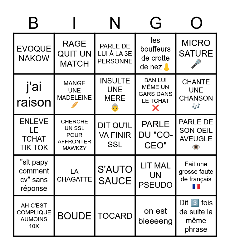 This bingo card has 25 words: LA CHAGATTE, TOCARD, INSULTE UNE MERE 👵, AH C'EST COMPLIQUE AUMOINS 10X, MICRO SATURE 🎤, EVOQUE NAKOW, j'ai raison, RAGE QUIT UN MATCH, PARLE DU "CO-CEO", S'AUTO SAUCE, BAN LUI MÊME UN GARS DANS LE TCHAT ❌, ENLEVE LE TCHAT TIK TOK, LIT MAL UN PSEUDO, Fait une grosse faute de français 🇫🇷, MANGE UNE MADELEINE 🥖, Dit 3️⃣ fois de suite la même phrase, PARLE DE SON OEIL AVEUGLE 👁️, PARLE DE LUI À LA 3E PERSONNE, CHANTE UNE CHANSON 🎶, CHERCHE UN SSL POUR AFFRONTER MAWKZY, DIT QU'IL VA FINIR SSL, BOUDE, "slt papy comment cv" sans réponse, les bouffeurs de crotte de nez👃 and on est bieeeeng.