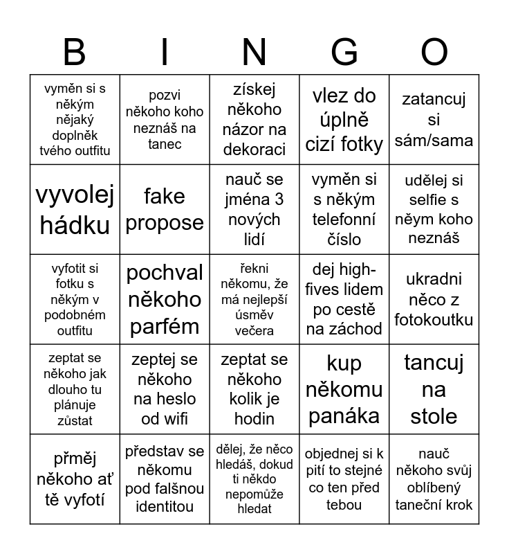 This bingo card has a free space and 24 words: zeptej se někoho na heslo od wifi, představ se někomu pod falšnou identitou, nauč se jména 3 nových lidí, přměj někoho ať tě vyfotí, zatancuj si sám/sama, vyměn si s někým nějaký doplněk tvého outfitu, vyvolej hádku, pozvi někoho koho neznáš na tanec, dej high-fives lidem po cestě na záchod, zeptat se někoho kolik je hodin, vyměn si s někým telefonní číslo, vyfotit si fotku s někým v podobném outfitu, kup někomu panáka, tancuj na stole, fake propose, objednej si k pití to stejné co ten před tebou, ukradni něco z fotokoutku, získej někoho názor na dekoraci, udělej si selfie s něym koho neznáš, pochval někoho parfém, nauč někoho svůj oblíbený taneční krok, zeptat se někoho jak dlouho tu plánuje zůstat, vlez do úplně cizí fotky and dělej, že něco hledáš, dokud ti někdo nepomůže hledat.