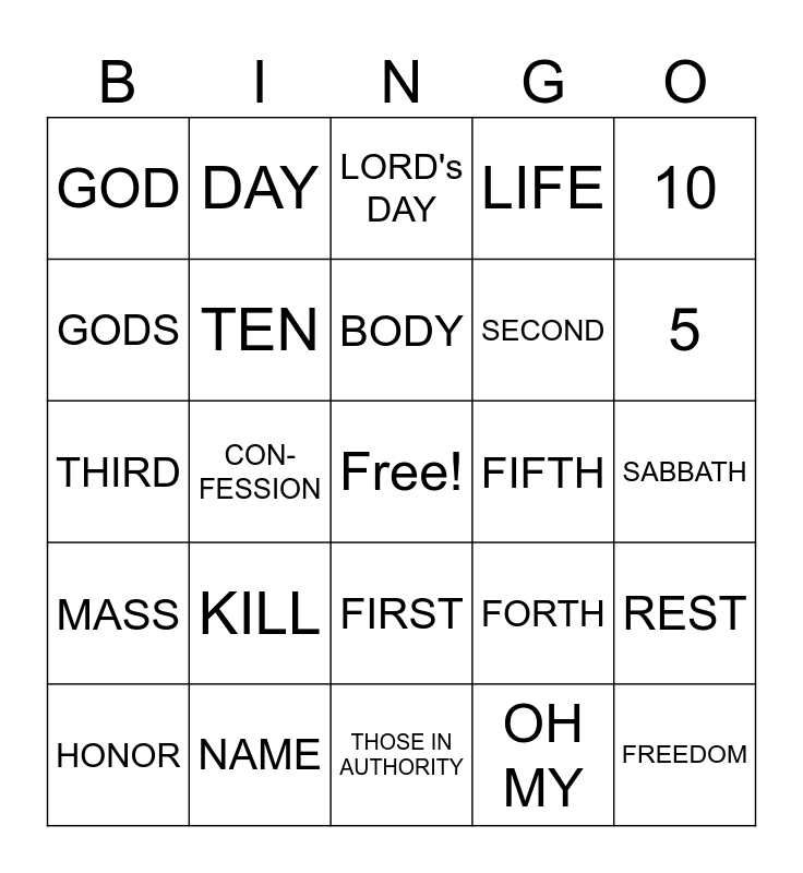 This bingo card has a free space and 24 words: KILL, NAME, BODY, HONOR, 10, GOD, GODS, DAY, FIFTH, FIRST, SECOND, THIRD, FORTH, REST, TEN, OH MY, SABBATH, LORD's DAY, 5, CON-FESSION, FREEDOM, MASS, LIFE and THOSE IN AUTHORITY.