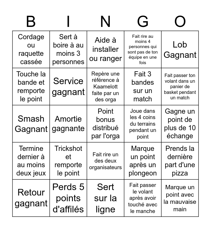 This bingo card has a free space and 24 words: Trickshot et remporte le point, Perds 5 points d'affilés, Repère une référence à Kaamelott faite par un des orga, Retour gagnant, Lob Gagnant, Cordage ou raquette cassée, Touche la bande et remporte le point, Sert à boire à au moins 3 personnes, Joue dans les 4 coins du terrains pendant un point, Fait rire un des deux organisateurs, Fait 3 bandes sur un match, Smash Gagnant, Marque un point après un plongeon, Prends la dernière part d'une pizza, Service gagnant, Fait passer le volant après avoir touché avec le manche, Gagne un point de plus de 10 échange, Aide à installer ou ranger, Fait passer ton volant dans un panier de basket pendant un match, Amortie gagnante, Marque un point avec la mauvaise main, Termine dernier à au moins deux jeux, Fait rire au moins 4 personnes qui sont pas de ton équipe en une fois and Sert sur la ligne.