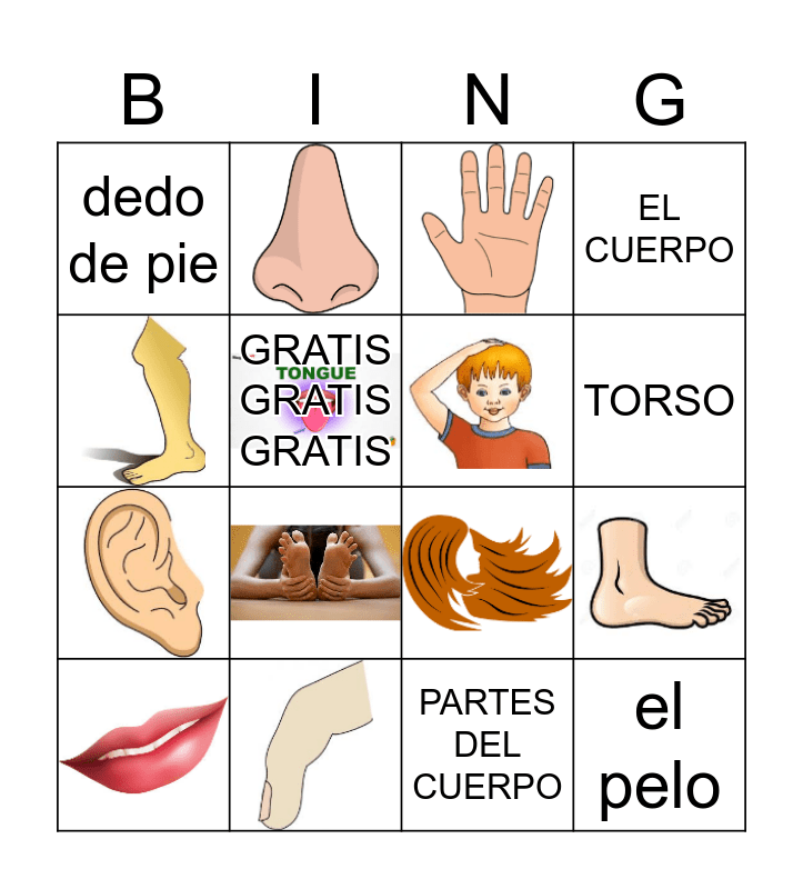 This bingo card has 14 images and 7 words: dedo de pie, GRATIS GRATIS GRATIS, el pelo, el estómago, TORSO, EL CUERPO and PARTES DEL CUERPO.