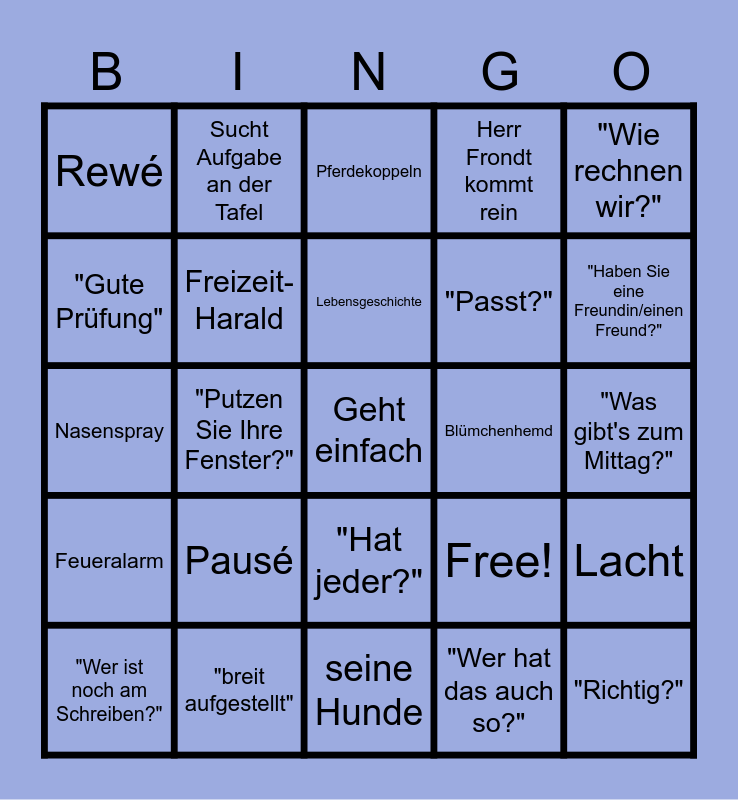 This bingo card has 25 words: Pausé, seine Hunde, Lebensgeschichte, "Wer ist noch am Schreiben?", "Wie rechnen wir?", Rewé, "Gute Prüfung", Sucht Aufgabe an der Tafel, Blümchenhemd, "Hat jeder?", "Passt?", Nasenspray, Free!, Lacht, Freizeit-Harald, "Richtig?", "Was gibt's zum Mittag?", Pferdekoppeln, "Haben Sie eine Freundin/einen Freund?", "Putzen Sie Ihre Fenster?", Geht einfach, "breit aufgestellt", Feueralarm, Herr Frondt kommt rein and "Wer hat das auch so?".