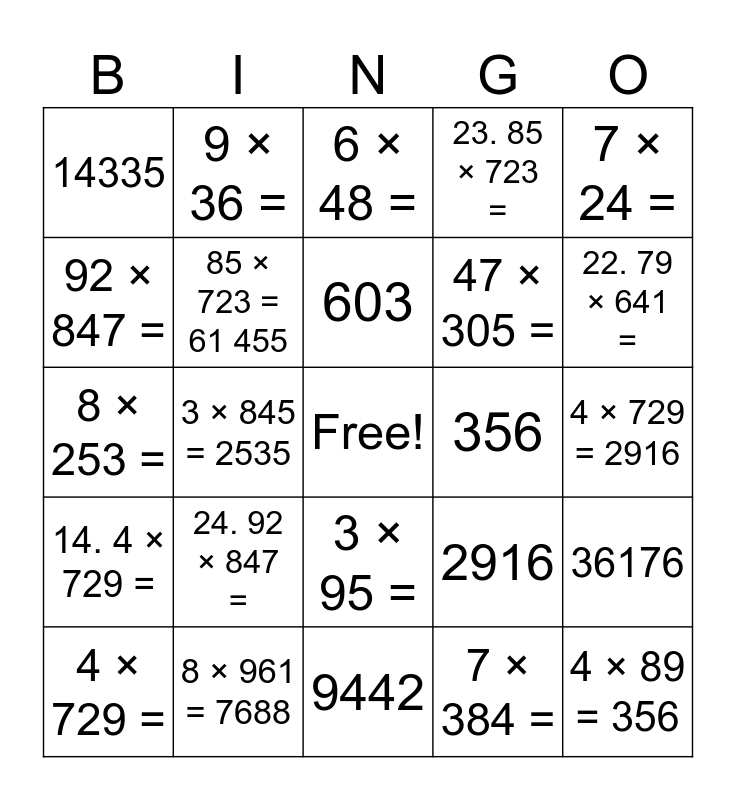 This bingo card has a free space and 102 words: can you make 24 multiplication equations for a grade 5/6 class some that are 1 digit by 2, some that are 1 digit by 3 and some that are 2 digit by 3 digitHere are 24 multiplication equations suitable for a Grade 5/6 class, mixed evenly between t, 1-digit × 2-digit (8 questions), 7 × 24 =, 9 × 36 =, 6 × 48 =, 8 × 57 =, 5 × 73 =, 4 × 89 =, 3 × 95 =, 9 × 67 =, 1-digit × 3-digit (8 questions), 9. 6 × 142 =, 10. 8 × 253 =, 11. 7 × 384 =, 12. 5 × 476 =, 13. 9 × 518 =, 14. 4 × 729 =, 15. 3 × 845 =, 16. 8 × 961 =, 2-digit × 3-digit (8 questions), 17. 23 × 456 =, 18. 34 × 278 =, 19. 47 × 305 =, 20. 56 × 419 =, 21. 68 × 532 =, 22. 79 × 641 =, 23. 85 × 723 =, 24. 92 × 847 =, These range from fairly straightforward to ones that will require careful carrying and place-value thinking—perfect for Grade 5/6 practice or review. Enjoy!4.6sFastok can you make them into a combined list with no 1. 2. etc.Here’s a combined list, 7 × 24 =, 9 × 36 =, 6 × 48 =, 8 × 57 =, 5 × 73 =, 4 × 89 =, 3 × 95 =, 9 × 67 =, 6 × 142 =, 8 × 253 =, 7 × 384 =, 5 × 476 =, 9 × 518 =, 4 × 729 =, 3 × 845 =, 8 × 961 =, 23 × 456 =, 34 × 278 =, 47 × 305 =, 56 × 419 =, 68 × 532 =, 79 × 641 =, 85 × 723 =, 92 × 847 =, Ready to print or copy straight into a worksheet!1sFastgood now can you give me the answers pleaseHere are the answers in the same order as the combined list:, 7 × 24 = 168, 9 × 36 = 324, 6 × 48 = 288, 8 × 57 = 456, 5 × 73 = 365, 4 × 89 = 356, 3 × 95 = 285, 9 × 67 = 603, 6 × 142 = 852, 8 × 253 = 2024, 7 × 384 = 2688, 5 × 476 = 2380, 9 × 518 = 4662, 4 × 729 = 2916, 3 × 845 = 2535, 8 × 961 = 7688, 23 × 456 = 10 488, 34 × 278 = 9442, 47 × 305 = 14 335, 56 × 419 = 23 464, 68 × 532 = 36 176, 79 × 641 = 50 639, 85 × 723 = 61 455, 92 × 847 = 77 924, You can keep this answer key separate from the student sheet. Happy teaching!1.4sFastok now just the answers please168, 324, 288, 456, 365, 356, 285, 603, 852, 2024, 2688, 2380, 4662, 2916, 2535, 7688, 10488, 9442, 14335, 23464, 36176, 50639, 61455 and 77924.