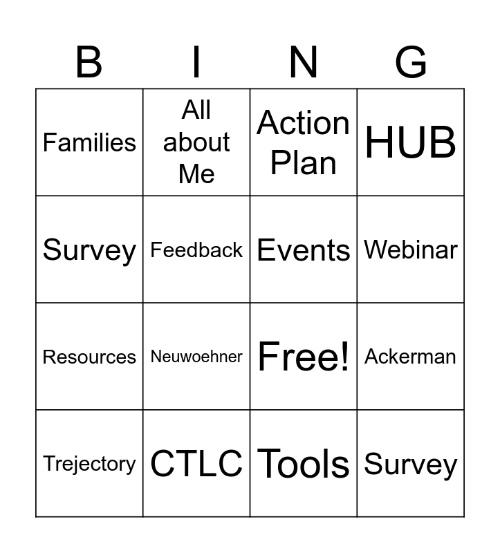 This bingo card has 21 words: CTLC, North Tech, All about Me, Unity Day, Tools, Events, Families, Action Plan, Free!, Webinar, Resources, HUB, Survey, Transition, Feedback, FACE, Trejectory, Neuwoehner, Survey, Ackerman and WSW.