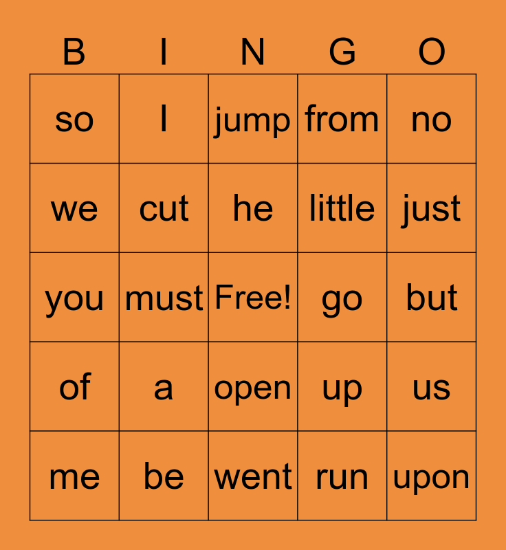 This bingo card has a free space and 24 words: a, be, he, me, no, so, we, I, go, open, little, you, up, us, cut, run, but, jump, just, must, upon, of, from and went.