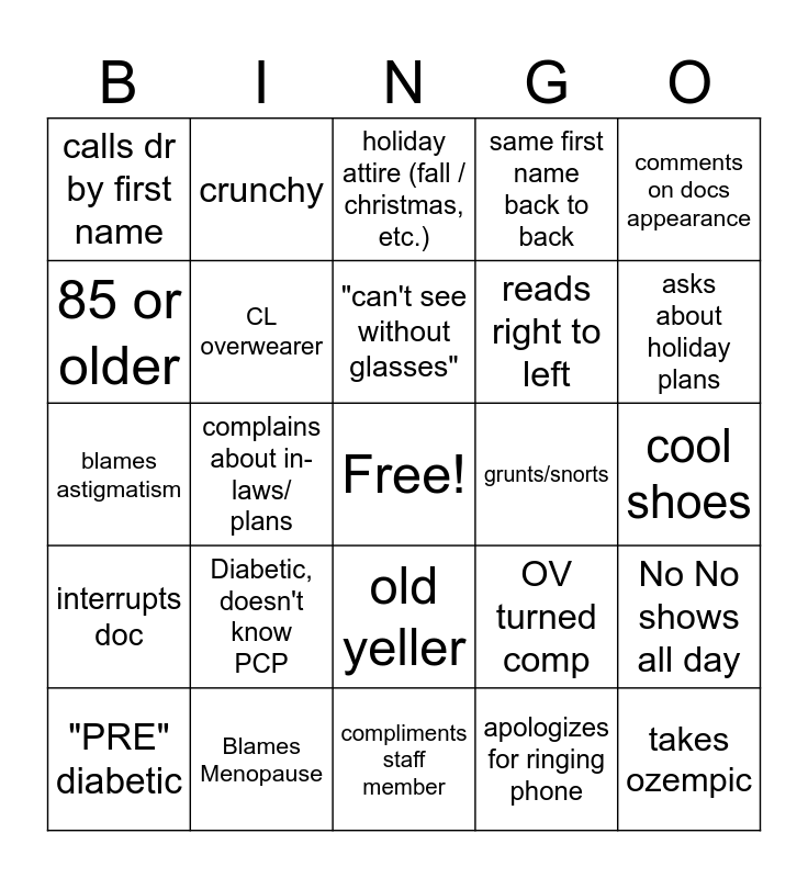 This bingo card has a free space and 24 words: Diabetic, doesn't know PCP, Blames Menopause, "can't see without glasses", "PRE" diabetic, comments on docs appearance, calls dr by first name, 85 or older, crunchy, grunts/snorts, old yeller, reads right to left, blames astigmatism, OV turned comp, No No shows all day, CL overwearer, apologizes for ringing phone, cool shoes, holiday attire (fall / christmas, etc.), asks about holiday plans, complains about in-laws/ plans, takes ozempic, interrupts doc, same first name back to back and compliments staff member.