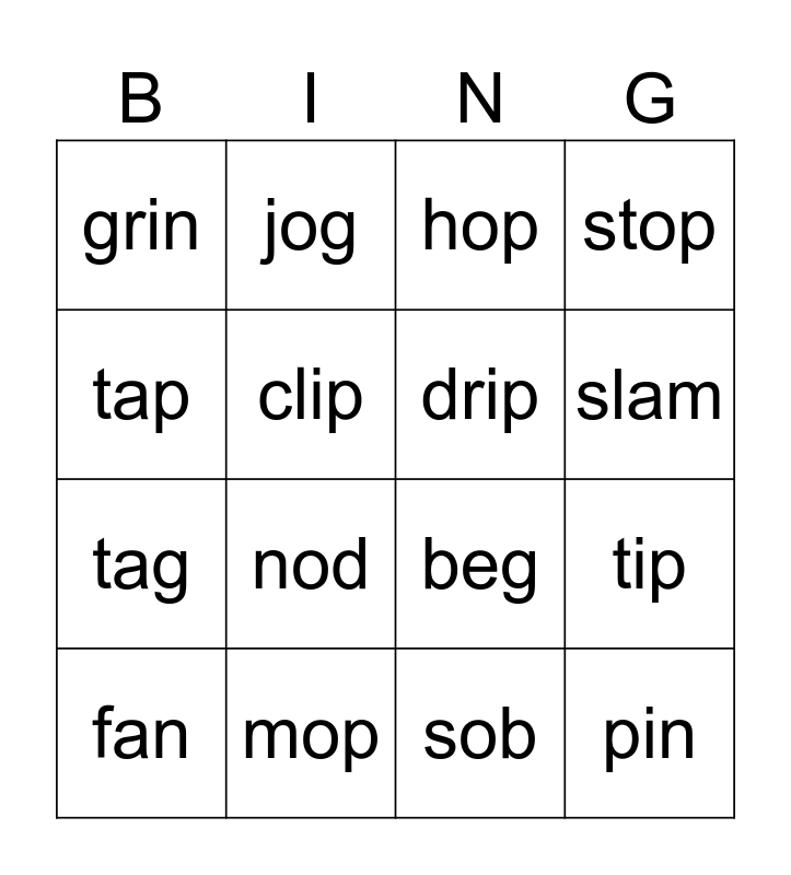 This bingo card has 16 words: mop, tip, hop, grin, tag, jog, beg, sob, tap, clip, fan, stop, nod, slam, drip and pin.