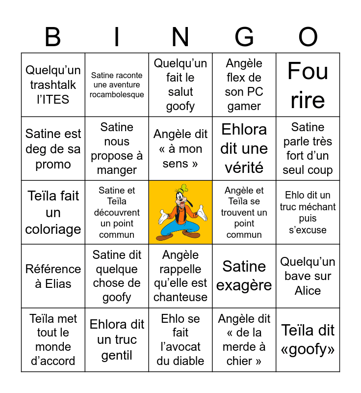 This bingo card has a free space and 24 words: Satine dit quelque chose de goofy, Ehlora dit un truc gentil, Angèle dit « à mon sens », Teïla met tout le monde d’accord, Fou rire, Quelqu’un trashtalk l’ITES, Satine est deg de sa promo, Satine raconte une aventure rocambolesque, Angèle et Teïla se trouvent un point commun, Angèle rappelle qu’elle est chanteuse, Ehlora dit une vérité, Teïla fait un coloriage, Satine exagère, Quelqu’un bave sur Alice, Satine nous propose à manger, Angèle dit « de la merde à chier », Ehlo dit un truc méchant puis s’excuse, Quelqu’un fait le salut goofy, Satine parle très fort d’un seul coup, Satine et Teïla découvrent un point commun, Teïla dit «goofy», Référence à Elias, Angèle flex de son PC gamer and Ehlo se fait l’avocat du diable.
