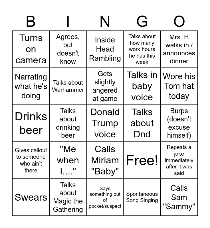 This bingo card has 25 words: "Me when I....", Says something out of pocket/suspect, Gets slightly angered at game, Swears, Mrs. H walks in / announces dinner, Turns on camera, Narrating what he's doing, Agrees, but doesn't know, Talks about Dnd, Calls Miriam "Baby", Talks in baby voice, Drinks beer, Free!, Repeats a joke immediately after it was said, Talks about Warhammer, Calls Sam "Sammy", Burps (doesn't excuse himself), Inside Head Rambling, Wore his Tom hat today, Talks about drinking beer, Donald Trump voice, Talks about Magic the Gathering, Gives callout to someone who ain't there, Talks about how many work hours he has this week and Spontaneous Song Singing.