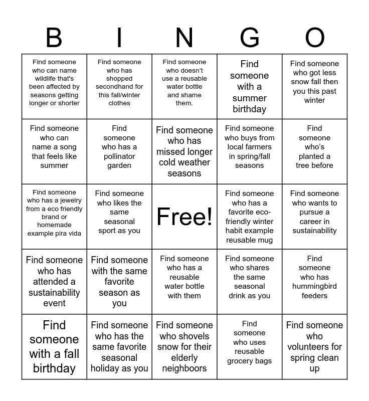 This bingo card has a free space and 24 words: Find someone with the same favorite season as you, Find someone who has the same favorite seasonal holiday as you, Find someone who has missed longer cold weather seasons, Find someone with a fall birthday, Find someone who got less snow fall then you this past winter, Find someone who can name wildlife that's been affected by seasons getting longer or shorter, Find someone who can name a song that feels like summer, Find someone who has shopped secondhand for this fall/winter clothes, Find someone who has a favorite eco-friendly winter habit example reusable mug, Find someone who has a reusable water bottle with them, Find someone who buys from local farmers in spring/fall seasons, Find someone who has a jewelry from a eco friendly brand or homemade example pira vida, Find someone who shares the same seasonal drink as you, Find someone who has hummingbird feeders, Find someone who has a pollinator garden, Find someone who uses reusable grocery bags, Find someone who wants to pursue a career in sustainability, Find someone who doesn’t use a reusable water bottle and shame them., Find someone who’s planted a tree before, Find someone who likes the same seasonal sport as you, Find someone who volunteers for spring clean up, Find someone who has attended a sustainability event, Find someone with a summer birthday and Find someone who shovels snow for their elderly neighboors.