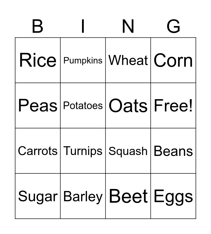 This bingo card has 17 words: Beet, Sugar, Wheat, Rice, Turnips, Corn, Beans, Oats, Free!, Potatoes, Barley, Squash, Peas, Pumpkins, Carrots, Tomatoes and Eggs.