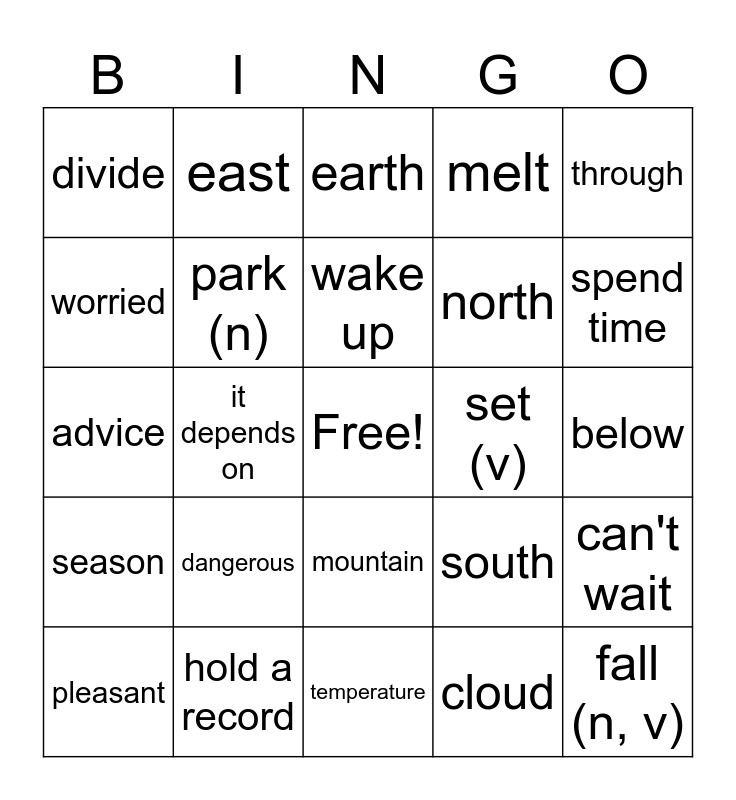 This bingo card has a free space and 70 words: arrive, below, extreme, feel like, hold a record, leave, melt, swimming pool, through, turn off, can't wait, capital, divide, earth, famous, it depends on, mountain, north, river, season, set (v), south, spend time, strange, vacation, certainly, check (v), close [adj], cloud, curly, east, farmer, field, finger, hope, low, predict, west, wet, worried, coat, dangerous, fall (n, v), get on, ground (n), park (n), pleasant, rain (n, v), scarf, sea, shine, snow (n), stay, surprised, temperature, turn on, wake up, warm (adj), weather, wind (n), advice, bone, fan, ice cream cone, problem, shade, solution, solve, sticky and sweat.