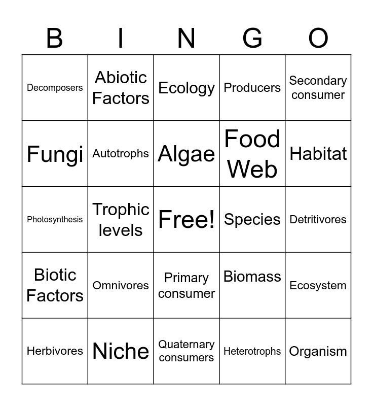 This bingo card has a free space and 27 words: Biomass, Food Chain, Food Web, Quaternary consumers, Fungi, Ecology, Abiotic Factors, Biotic Factors, Species, Ecosystem, Photosynthesis, Producers, Herbivores, Niche, Habitat, Competitive Exclusion Principle, Autotrophs, Algae, Omnivores, Decomposers, Detritivores, Heterotrophs, Trophic levels, Organism, Primary consumer, Secondary consumer and Tertiary consumer.